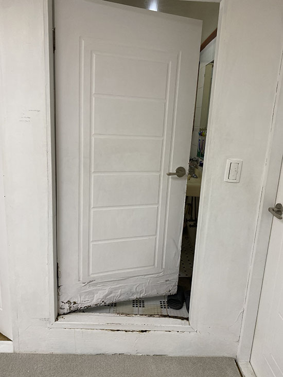 화장실 문짝이 물을 많이 먹어 무거워지고