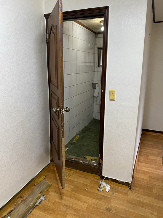 화장실 문짝이 물을 많이 먹어 무거워지고